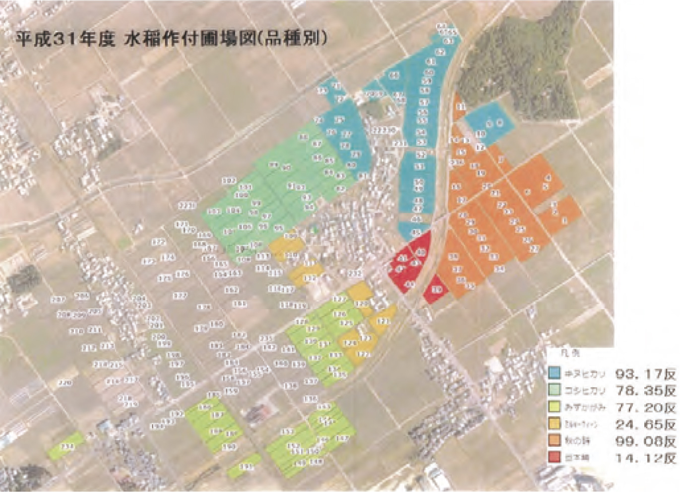 例えば、品種毎に色分けすることにより、作付品種の大まかな圃場数やエリアを把握することができます。さらに圃場番号を文字で表示させる機能(=ラベル表示機能)を使えば、単にポリゴンデータ(地