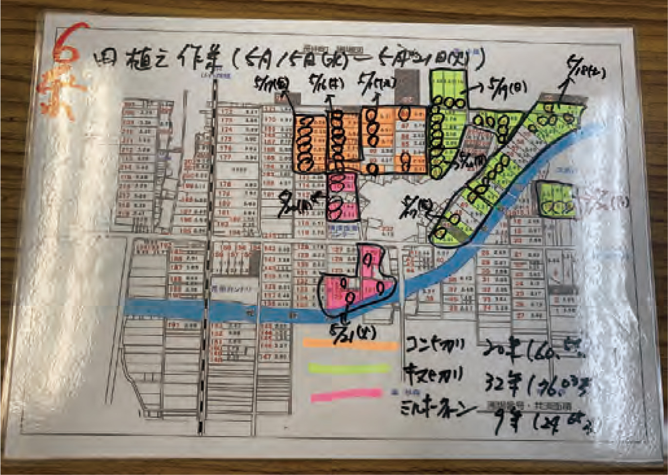 おさだでは、5年前から写真-6のような作業指示書を作成しています。組合員は作業前に指示書を確認してから作業を行います。作業指示者は作業数に応じた枚数を出力し、品種ごとにマーカーで色分けし、作業日を記入します。作業者は指示された作業が終わった圃場に手書きで○を記入します。