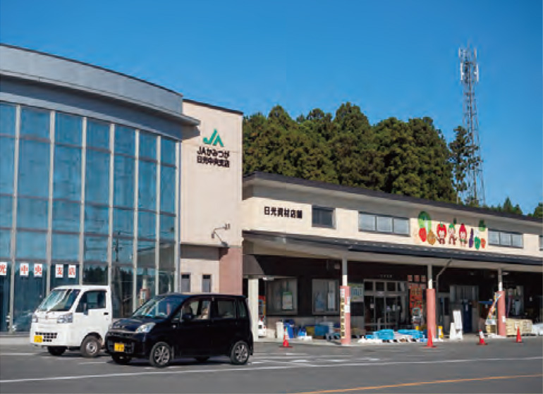 JAかみつが日光営農経済センター。広い敷地に直売所や資材店舗が併設されている。
