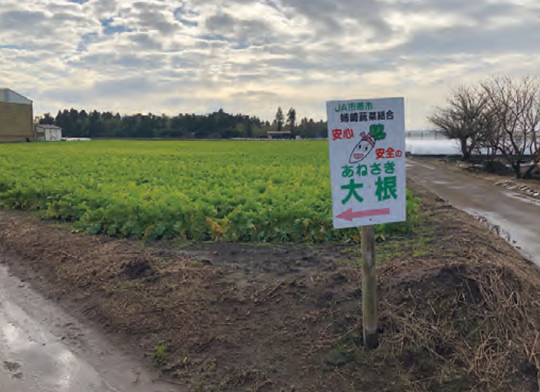 「姉崎だいこん」とは「JA市原市姉崎集出荷場」で洗浄・選別・出荷されたダイコンをいいます。生産者は、毎朝泥付きのダイコンを集出荷場に持ち込み、共同洗浄選別施設で洗浄や梱包を行います。作業時間の大半を占めていた洗浄や選別などを、共同施設での一括作業としたことにより、品質が向上した上、組合員も栽培に専念できるょうになりました。こうした取り組みが評価され、同組合は2013年に日本農業賞(集団組織の部)の特別賞に選ばれました。
